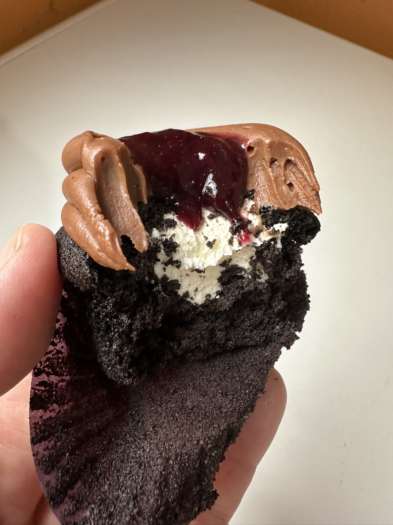 ganache de chocolate, chantilly e uma colheradinha de geleia de amora